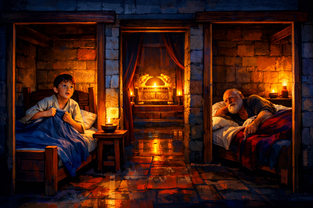 Eli, still half-asleep, rubbed his eyes and said, “I didn’t call you, my son. Go back to bed.”