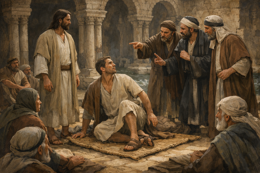 John 5:4, the angel stirring the waters of Bethesda (angelos, ἄγγελος, “messenger, angel”): “For an angel went down at a certain season into the pool…” Also absent. This was probably a marginal explanation folded into the text by a scribe. And it paints God like a lottery host. First one wins. That’s not the Gospel. Yeshua bypassed the pool entirely. He was the healing.