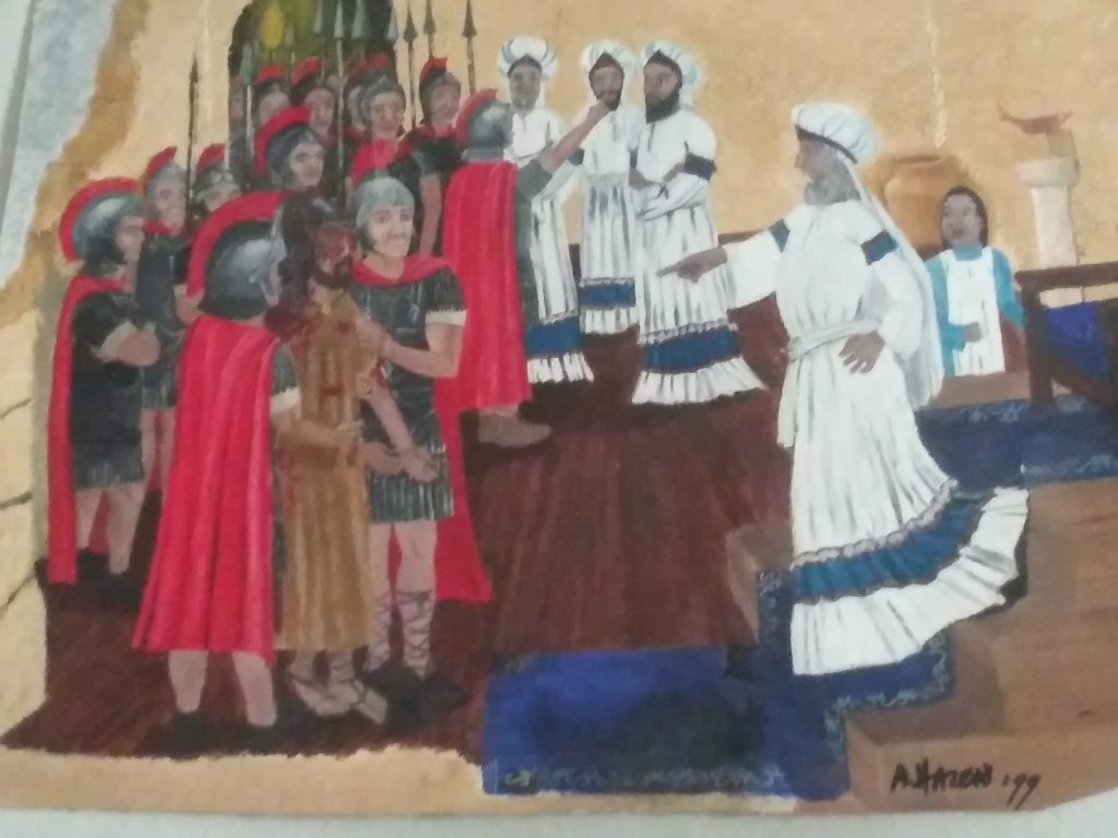 Oil painting done by Anna M. C. Hazen 1999 Caiaphas condemning Yeshua to death.