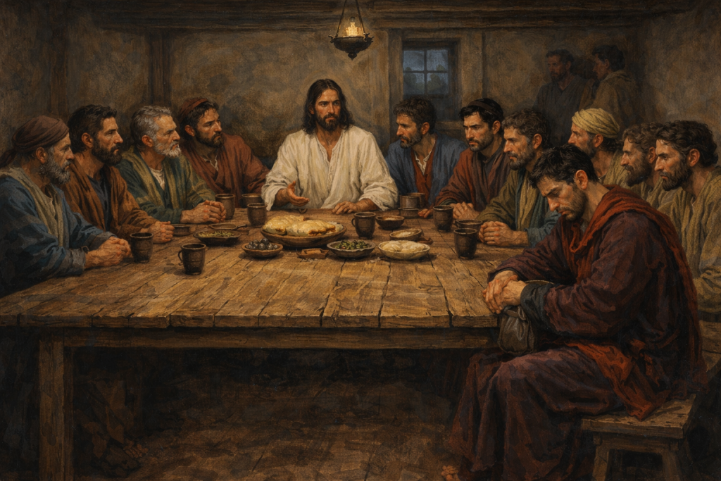 Even as Jesus spoke of betrayal, the disciples’ hearts were a mixture of awe, confusion, and mounting tension. Some glanced at one another, unable to fully grasp the magnitude of what He was saying. Peter’s indignation surfaced briefly at the mention of denial, while John leaned in, searching the Master’s eyes for understanding. The room was quiet at key moments, the kind of silence that presses on the soul, broken only by the careful ritual motions of the meal. Their astonishment was natural. They were witnessing covenant fulfillment, prophecy in motion, and the Lamb’s own body and blood presented before them. In this intimate, second-story chamber, nothing escaped attention: every glance, every gesture, every word carried eternal weight, and the disciples felt it deeply, though they could not yet fully comprehend.