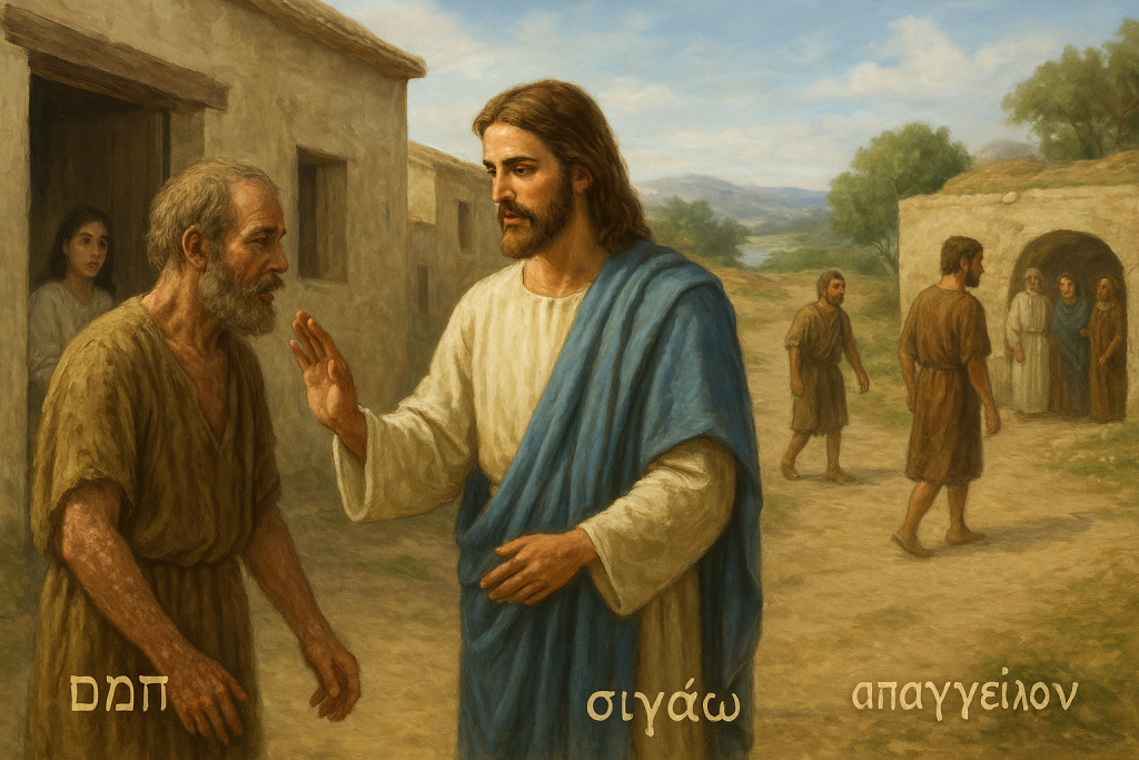 Compare that to the demoniac in the Decapolis. There, Yeshua said, “Go home to your own people and tell them how much the Lord has done for you” (Mark 5:19). This was Gentile territory, outside the volatile Jewish towns. Here, speaking would spread faith without immediate danger. The word ἀπάγγειλον (apangeilon) means to bring tidings, the root of angelos, messenger. Silence protects; speech spreads salvation.